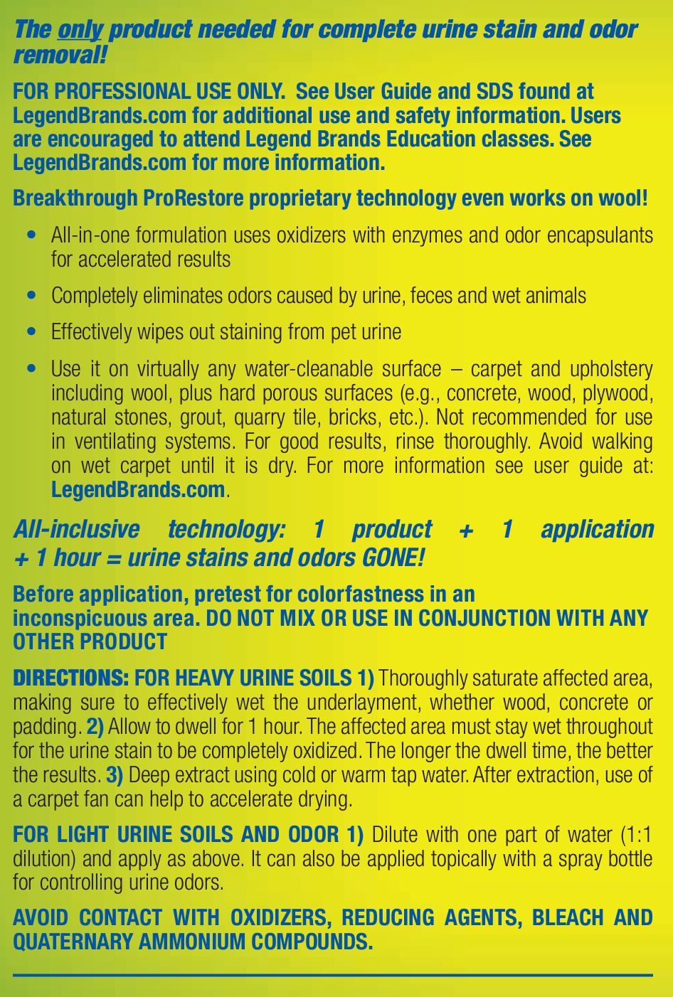 Pour directly on the contaminated area. Let dwell for 1 hour. Extract and rinse thoroughly with clean water. For light odors, dilute 1:1. For heavy contamination, use full strength. Avoid using heat.