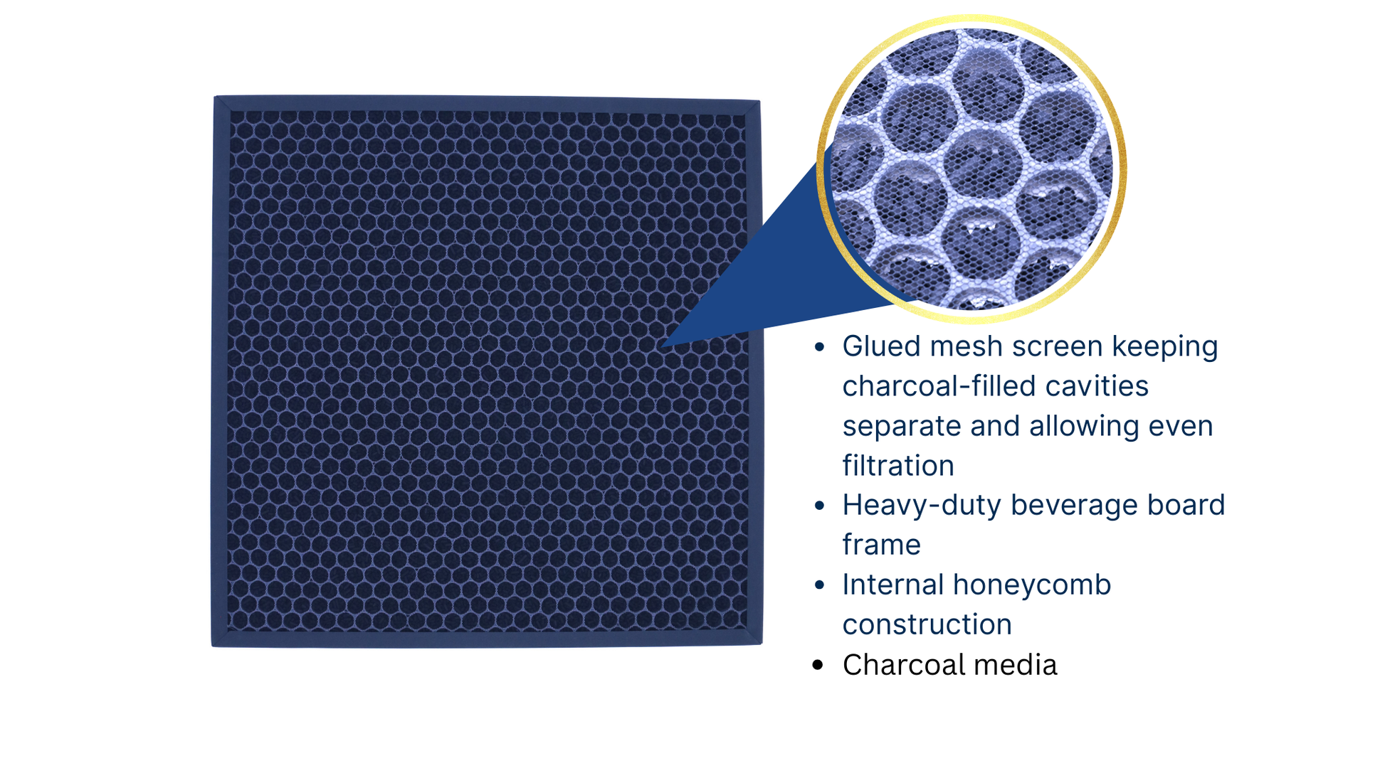 - High Dust Holding Capacity: Including the glued screen separating individual charcoal-filled cavities for even filtration. The pleated design increases the surface area of the filter, allowing it to hold more dust and debris without reducing airflow, thereby extending the filter’s service life and maintaining optimal air scrubber performance.