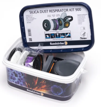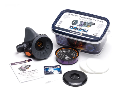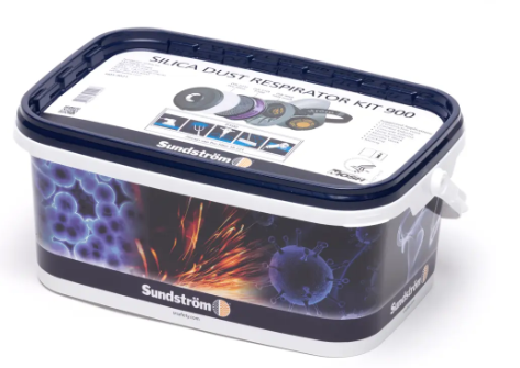 SR 900 L, SR 510 P100 (1), SR 221 prefilter (10), prefilter holder, SR 5226 cleaning wipe SR 368 ID tag and storage box. Can be used for concrete, stone, cement, fracking and more. Can be converted to a remote filter respirator by adding SR 905 system.